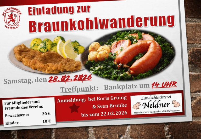 Am 28.02.2026 ist es wieder soweit! Der SVK lädt ein zur traditionellen Braunkohlwanderung. Also schnürt die Stiefel und seid dabei. Treffpunkt: 14 Uhr Bankplatz Anmeldungen: Bitte bis zum 22.02.2026 an Boris Grünig & Sven Brunke Wir freuen uns über jede Menge Anmeldungen.